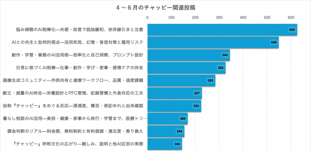 次いで、「擬人化と依存の揺らぎ」627件、「仕事・学習・生活で相棒化」582件、「友人化するAI活用」569件、「チャッピーの画像生成評価」560件、「Geminiとチャッピー比較」463件、「主要相談窓口化するチャッピー」430件、「『チャッピー』呼称の賛否両論」419件、「チャッピー課金の実態」411件と続きます。