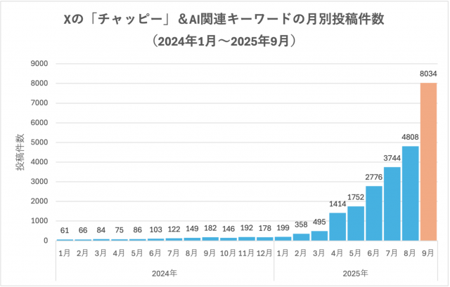 今回はX上の公開投稿を対象に「チャッピー」がAI関連語(ChatGPT、GPT、生成AIなど)と一緒に使われた投稿を集めて、月別に集計したり、どんな話題が言及されているかを分析してみました。