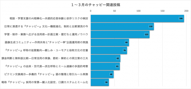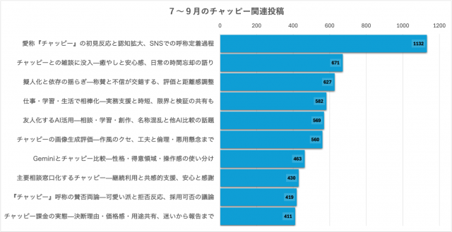 2025年7〜9月はさらに急増してピークを更新。最多は「愛称『チャッピー』の初見反応と認知拡大」で、「チャッピー」という呼称を知ったことへの驚きや流行への言及などが1132件でした。