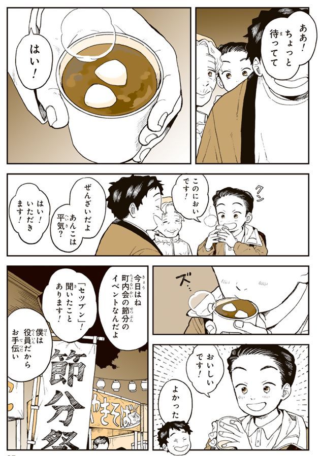 そんなダンくんがある日、ふと通りかかった節分祭で、あたたかいぜんざいを手渡されます。甘い香りと手のぬくもりで思い出したのは、ベトナムの母が屋台で売っていた「チェー」でした。日本のぜんざいによく似たココナツミルクのおやつです。