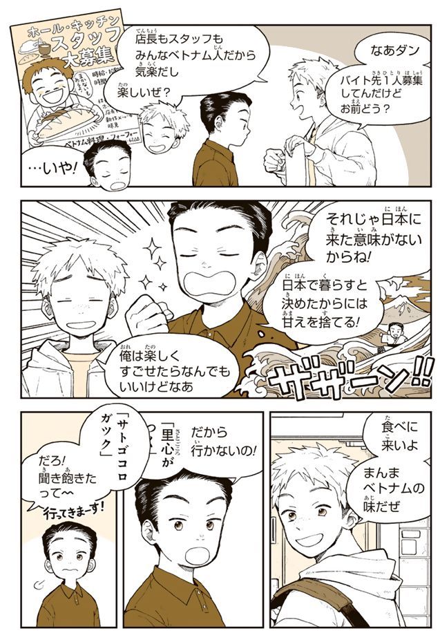 それでも「日本で暮らすと決めたからには甘えを捨てる!」と決意して、仲間にベトナム料理屋に誘われても「里心(サトゴコロ)」がつくからと断り、必死で立ち直ろうとします。