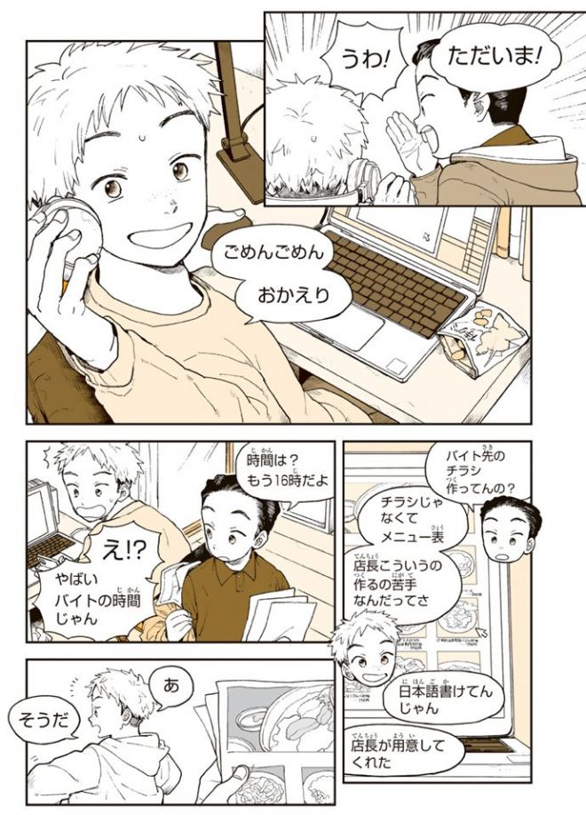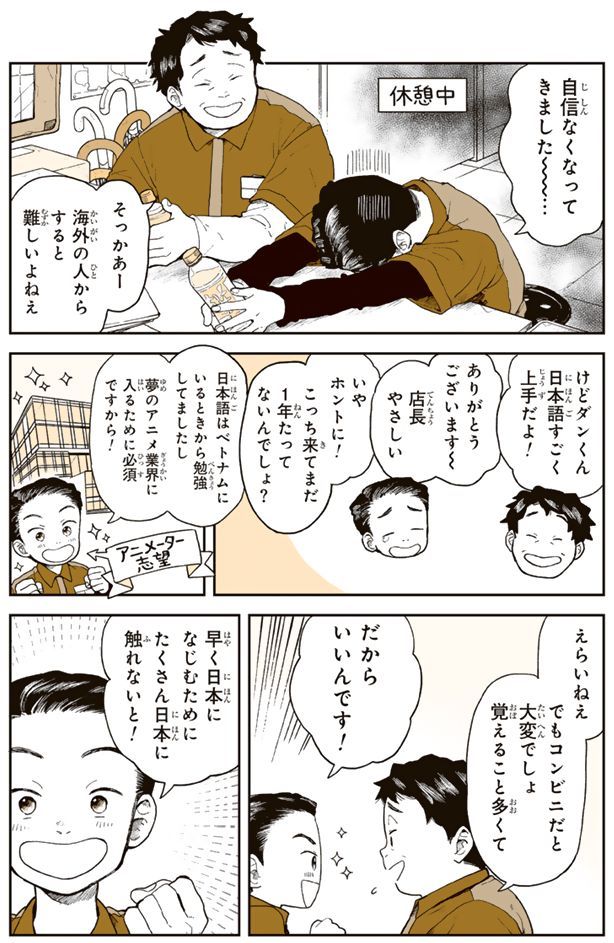 「コンビニで働けるのは、留学生の中でも特に日本語ができて、マルチタスクがこなせる優秀な人」と聞いた稲さんが描くダンくんは、アニメーターを目指して来日し、必死に勉強しながらバイトもがんばる一生懸命な学生です。