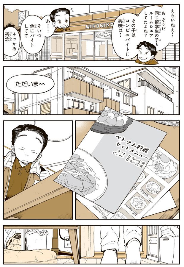 ベトナム料理屋のオーナーは日本語学校の先生でもあったため、留学生の事情を教えてくれました。店にはそのときも〝故郷の味〟を求めて留学生たちがやってきていたそうです。