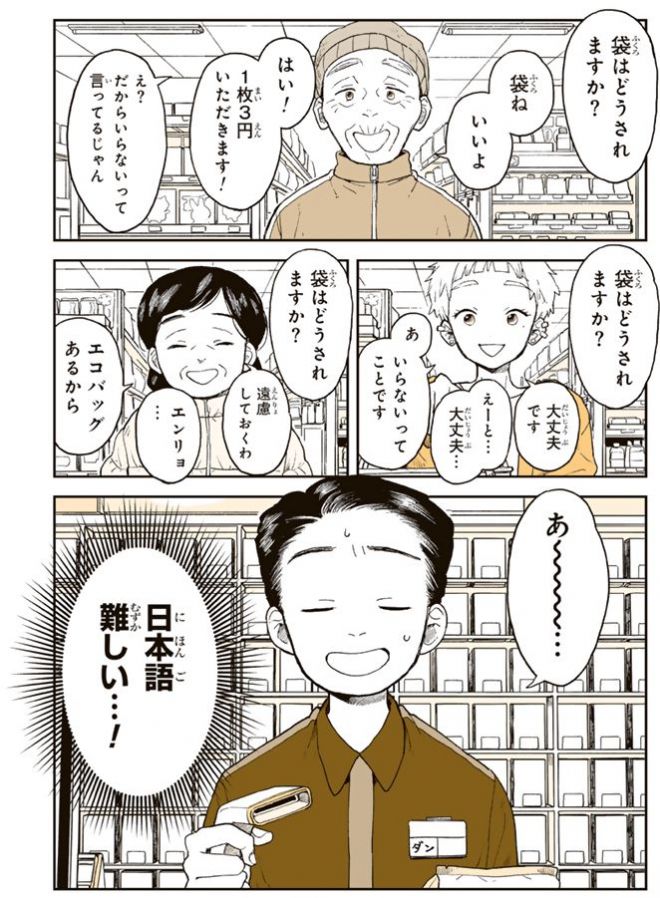 でも店頭では「袋はどうされますか?」に対して、「いいよ」「大丈夫」「遠慮しておくわ」など様々な答え方で断る客に、「日本語難しい…!」と打ちのめされたり、客に怒られたことで動揺して揚げ物を焦がしたりと、失敗することも。