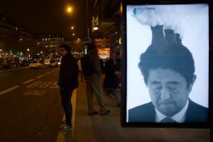 COP21開幕 パリに現れた風刺ポスター、安倍首相の頭に原発