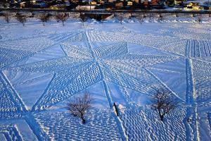 大雪に埋まった芸術、地元有志が再制作 青森「冬の田んぼアート」