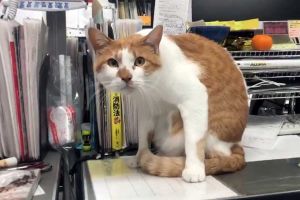 本物の「猫背」を見て! 職場猫タマスケ、デスク上で社員たちに披露