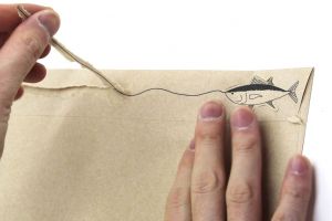 思わず開けたくなる封筒! 糸をたどると魚が釣れる「一本釣り封筒」