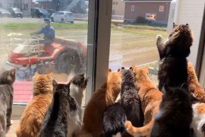 猫10数匹が「田植えキター!」 窓越しに目で追う動画、撮影者に聞く