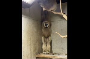 閉園後の動物園、部屋の隅っこで… 手を伸ばして固まったテナガザル