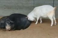 押すな、押すなよ!豚の尻に頭当てるヤギ 攻防の理由、飼育員に聞く
