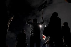 突き上げた拳、奥には日の丸 カメラマンが伝えたかった「国会デモ」