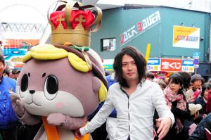 やる気なし?いや満々 ゆるキャラしんじょう君の隣に このロンゲ男