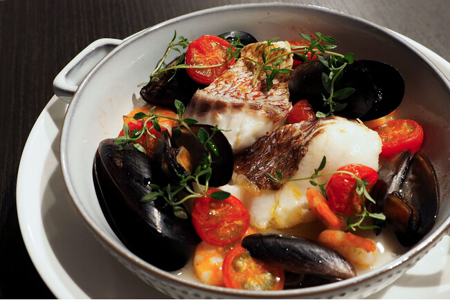 その他にも、アクアパッツァ(写真右)や、鶏もも肉の猟師風煮込みなどの煮込み料理をご用意。冬に温まること間違いなしのラインナップです。