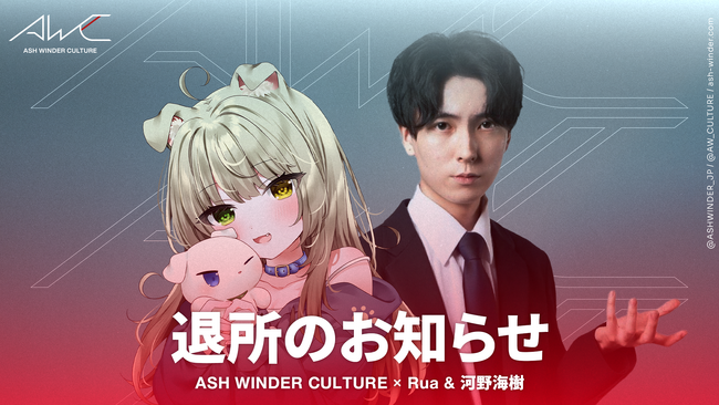 株式会社ASH WINDER(本社:大阪市中央区、代表取締役社長:Sun Junjie、最高経営責任者:Graham Zeng)は、eスポーツタレントMCN事業「ASH WINDER CULTURE」(以下「AWC」)に所属するTwitchにてゲーム配信活動を行う人気ストリーマーRua、VALORANT公式キャスターとして実況で活躍している河野海樹の2名が退所することをお知らせいたします。