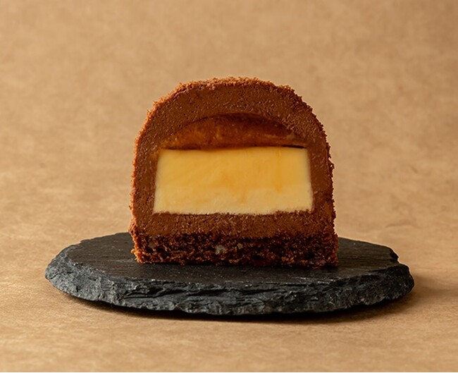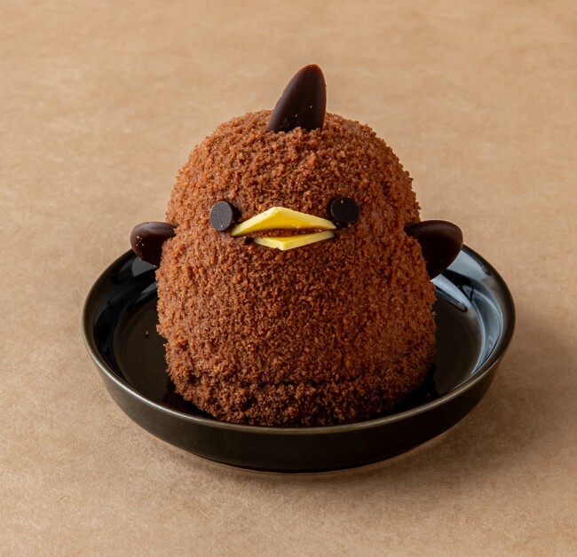 名古屋コーチンの卵と厳選バニラビーンズを使用した風味豊かなプリンを中南米産チョコレートのババロアで包み、溶け出すキャラメルを加えました。土台のガトーショコラには、くるみ、ヘーゼルナッツ、カカオニブを加え、ぴよりんのやわらかさと対象的なザクザク食感も楽しめます。ぴよりんの絵柄のついた有田焼のお皿にのせた、アムール限定特別仕様のぴよりんです。