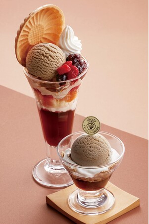 【和風デザート】・一番摘みほうじ茶アイスと紅茶ゼリーの和風パフェ/639円(税込702円)*画像左・一番摘みほうじ茶アイスのミニパフェ/369円(税込405円)*画像右