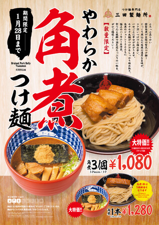 株式会社エムピーキッチンホールディングス(本社:東京都渋谷区、代表取締役:村上竹彦)が運営する『つけ麺専門店 三田製麺所』では2025年1/21(火)~1/28(火) の8日間限定で、『やわらか角煮つけ麺・特濃つけ麺』を国内の店舗にて期間限定販売いたします。