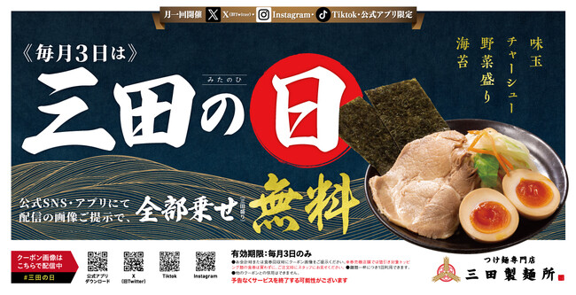 毎月3日は「三田の日」として、三田製麺所公式アプリ・X・Instagram・TikTok 限定でお得なクーポンを配信。クーポン画像やSNS画像のご提示で全部乗せトッピング「全部乗せ」をお一つ値引きしております。