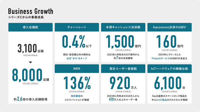 2024年に開始したFintech事業は急激な成長を遂げ、月謝制店舗のお金にまつわる業務改善に大きく寄与しています。さらに、現実世界の動きをデジタル世界につなぐ「SaaS × IoTハードウェア」の導入も進み、店舗におけるシームレスな顧客体験が飛躍的に向上しました。