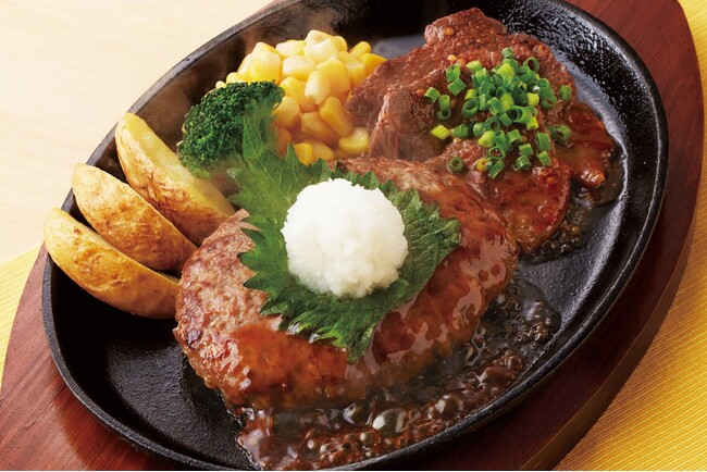 【ジョイフル「春の味わいキッチン」/メニュー】「和風おろしハンバーグ&牛サガリのうすぎりステーキ」/969円(税込1,065円)*TAKEOUT可
