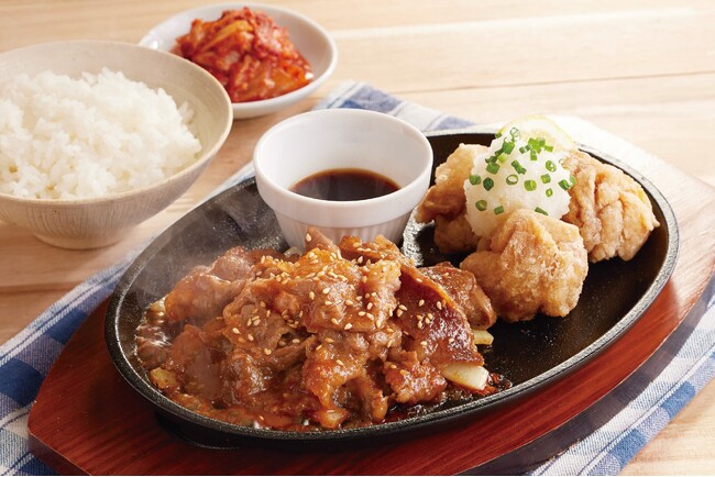 「新☆お肉メニュー」のラインナップは、牛100%ハンバーグと牛サガリの、牛肉を思いっきり楽しめる「和風おろしハンバーグ&牛サガリうすぎりステーキ」、お肉のコンボでご飯がすすむ「牛焼肉とおろし唐揚げ定食」、「牛すき煮とロースかつの旨味とじ定食」やチキンと14種のスパイス香るドライカレーを熱々の鉄板で楽しめる「ガーリックチキンの鉄板ドライカレー」の4品が登場!