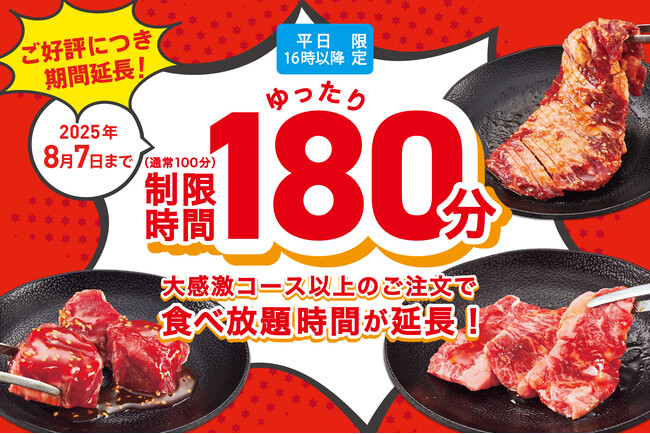 株式会社トマトアンドアソシエイツ(本社:兵庫県西宮市、代表取締役社長:笹村 啓介)が運営する、焼肉食べ放題「じゅうじゅうカルビ」では現在実施している、食べ放題コースの利用時間を通常100分のところ180分に時間拡大するキャンペーンを、8月7日まで期間を延長いたします。