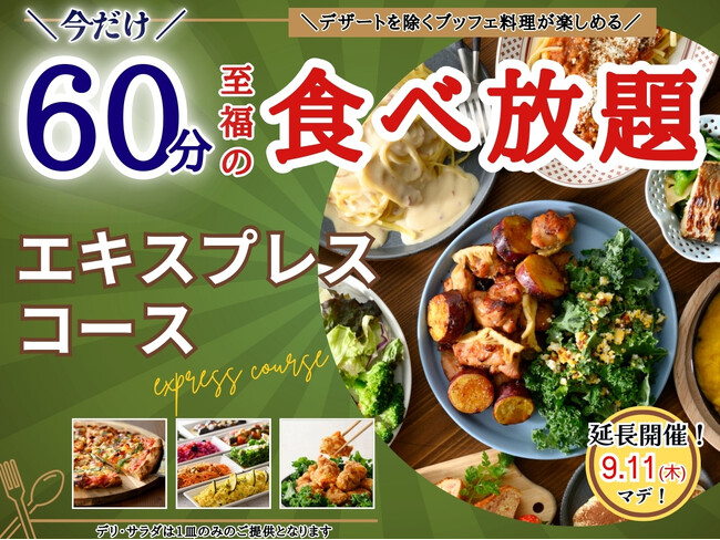【ご好評につき9/11迄延長開催!!】15分延長で食べ放題を満喫!ニラックスブッフェで大人気の45分『エキスプレスコース』が「60分食べ放題」に拡大!充実の食べ放題を思う存分お楽しみください!