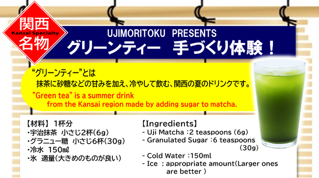 グリーンティーとは抹茶に砂糖などの甘みを加え、冷やして飲む関西の夏のドリンクです。お家でも簡単に作れるレシピをはじめ、お茶についてわかりやすく学べます。皆様のご参加を心よりお待ちしております。