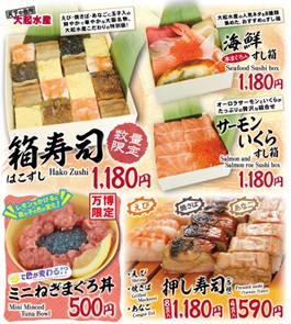併設店 天下の台所 大起水産 宴店『お寿司販売コーナー』もあります。商品の一部紹介1. 箱寿司・海鮮すし箱・サーモンいくらすし箱 各1,180円(税込)