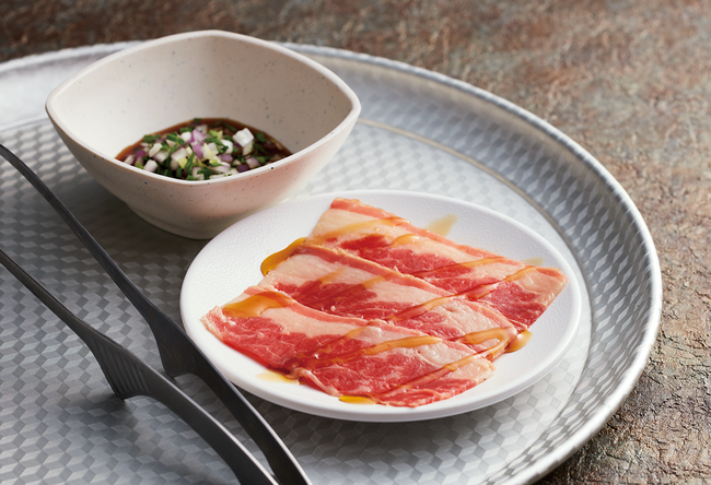 明洞のドラム缶焼肉をイメージしたオリジナルの香味野菜ダレにつけてお召し上がりいただく一品。キレのあるタレと、赤身と脂身のバランスが良い牛バラ肉は相性抜群です。