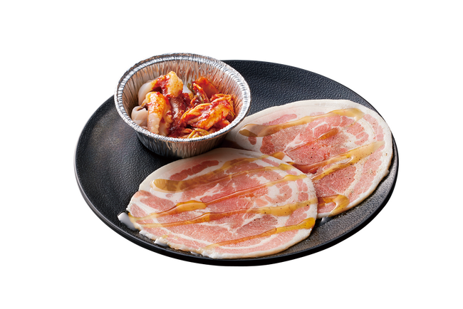 ぐるっと巻いた薄めのサムギョプサルに、温めたチュクミ(タコの辛味噌焼き)の旨味が相性抜群!チュクミをお肉で巻いてお召し上がりください。