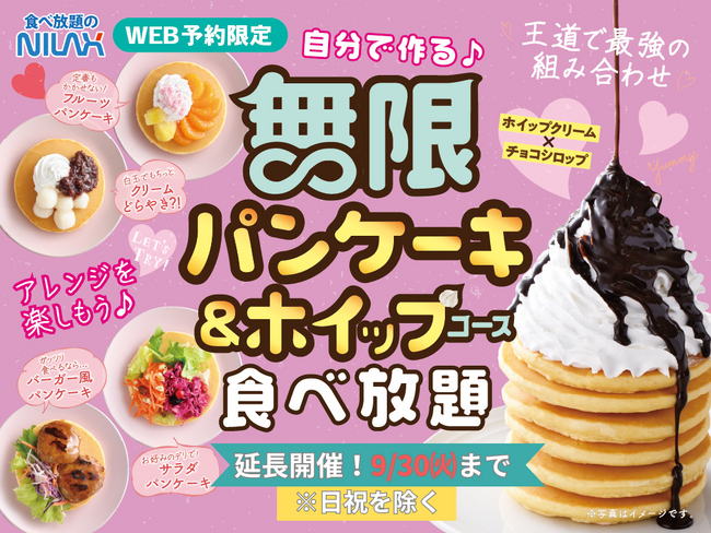 大人気企画が復活!『無限パンケーキ&ホイップクリーム』食べ放題!WEB予約(LINEで予約)限定「ニラックスブッフェ」39店舗にて事前予約受付中!
