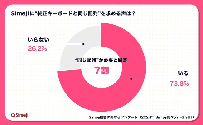 ■ユーザーの7割以上が「いつもの配列をSimejiでも使いたい」と回答Simejiが独自に実施したアンケート(n=3,961)では、「お持ちのスマートフォンの純正キーボードと同じ配列をSimejiでも使えるようにしてほしいか?」という質問に対して、73.8%が「いる」と回答。