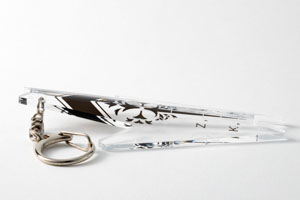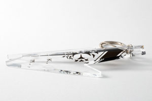 アクリル製造の専門メーカーの協力を得て、本来は什器・ショーケースのアクリル加工に使用される「アクリル曲げ技術」を、(恐らく)初めて一般グッズに応用。作品デザインの微細な形状を、成型によらず再現した。