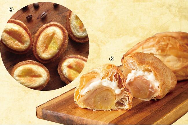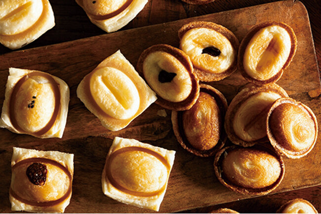 デニッシュとパイ生地の2種類の食感が楽しめるコーヒー豆の形をした一口サイズのスイーツ。