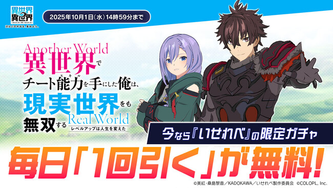 ゲーム内の「異世界でチート能力を手にした俺は、現実世界をも無双する ~レベルアップは人生を変えた~」限定ガチャを、毎日1回無料で引くことができます。