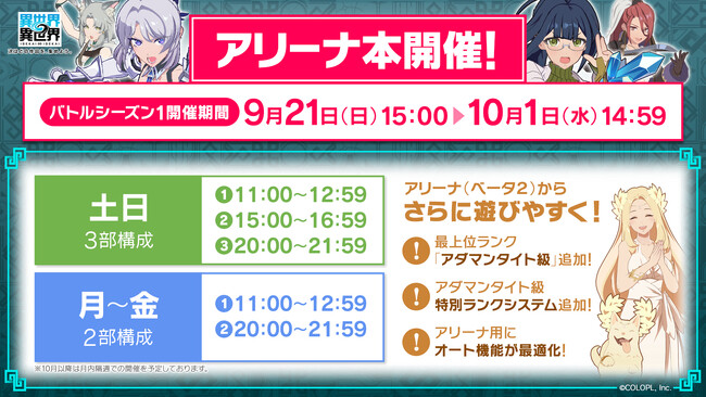 陣取りバトルが楽しめる「アリーナ」をついに本開催いたします。期間中、特定の時間で開催しますので、自分の自慢のパーティで挑戦してみましょう。時間については画像をご確認ください。