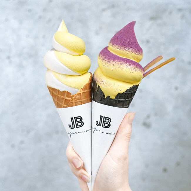 <MORIHICO.(モリヒコ)>JBソフトクリーム 左)ミックス(1個)748円、右)OIMO(1個)748円