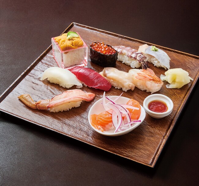 レッドオニオンを添えた北海道二海サーモン、まつかわカレイ、しゃこ、蒸しうに、ほっき貝、ボタン海老、生ズワイガニ、いくら、まぐろ、ニシンを使用した贅沢な10貫が味わえる。