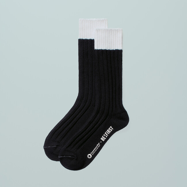 【内容】「コンビニエンスウェア」から2025年クリスマスアンバサダー「BE:FIRST」とのコラボレーションソックスです。異なる種類の太めの糸を組み合わせ、まるで手編みのようにざっくりと編まれたこだわりの1足です。厚手素材なので暖かく、秋冬のコーディネートを彩ります。つま先、かかとには補強糸を使用し、耐久性を高めました。抗菌防臭加工でニオイにくい仕様です。「BE:FIRST」のテーマカラーである黒と白を基調に、ロゴの世界観を表現しました。ライブコーデにはもちろん、普段使いもできるデザインです。