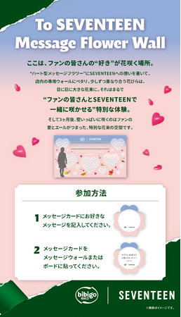 店内で“ハート型メッセージフラワー”(メッセージカード)を貰えます。SEVENTEENへの気持ちやイベントで過ごした特別な思い出を綴ったハート型メッセージフラワーを、店内の専用ウォール、またはボードに自由に貼り、来場者とSEVENTEENが一緒につくりあげる「ハートの壁」をお楽しみください。