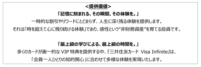 ■商品の特徴 『三井住友カード Visa Infinite』 は、「Infinite Potential, Infinite Value "無限の可能性が、無限の価値を生み出す。"」をコンセプトに、最上位ランクにふさわしい抜群の経済価値、異次元の多様な体験価値をご提供いたします。