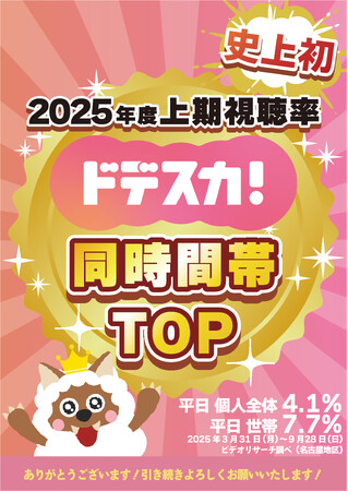 メ~テレ(名古屋テレビ放送)の朝の情報番組 『ドデスカ!』は2025年度上期(4~9月)の個人全体視聴率が4.1%(月~金・6~8時)、世帯視聴率が7.7%(月~金・6~8時)でともに同時間帯1位となりました。これは番組開始24年目にして初めてのことです。2025年3月から9月までは7カ月連続で同時間帯1位を継続。東海3県の各地からお届けする“とびだす”天気コーナーやコメンテーターを起用した様々な企画によるドラゴンズ情報の充実を背景に好調が続いています。10月クールからも『ドデスカ!』は「とびだせ!もっと地元に会いに行く。」をテーマにさらにパワーアップします!