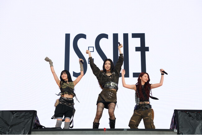 ■IS:SUE:新世代ガールズグループの圧倒的存在感 トップバッターを務めたのは、新世代ガールズグループ・IS:SUE。フェスの幕開けを飾った1曲目は、強烈に鼓膜を刺激するビートが特徴の楽曲「Breaking Thru the Line」。登場から深く被ったフードを一人ずつ外し新しいビジュアルを公開すると会場からは歓声が上がり、勢いそのままパワフルなラップと堂々としたパフォーマンスで観客を引き込みました。