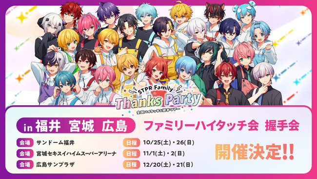 株式会社STPR(本社:東京都渋谷区、代表取締役:柏原真人、以下「STPR」)は、当社所属のクリエイター(通称:STPR Family)が“「感謝」を伝える”をテーマとしたイベント『STPR Family Thanks Party 全国ハイタッチ&握手ツアー』を、2025年10月より福井・宮城・広島の3都市にて順次開催することをお知らせいたします。