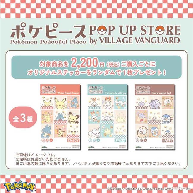 「ポケピース POP UP STORE by VILLAGE VANGUARD」において、「ポケピース」商品を2,200円(税込)お買い上げごとに、オリジナルステッカー(全3種)をランダムで1枚プレゼントいたします。