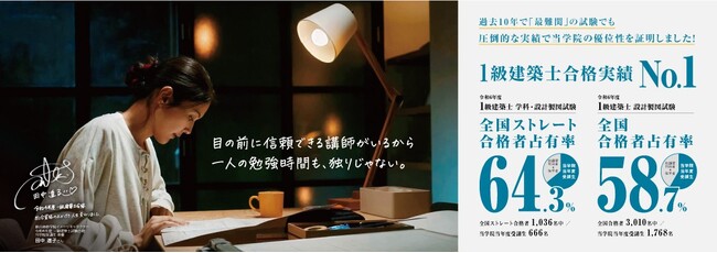 令和6年度1級建築士試験において、設計製図試験を合格者した方の58.7%(全国合格者3,010名中/当学院当年度受講生1,768名)を、また、学科試験と設計製図試験を1年で合格した方の64.3%(全国ストレート合格者1,036名中/当学院当年度受講生666名)を当学院当年度受講生が占め、「日本一」の合格実績を達成しています(令和7年1月15日現在)。