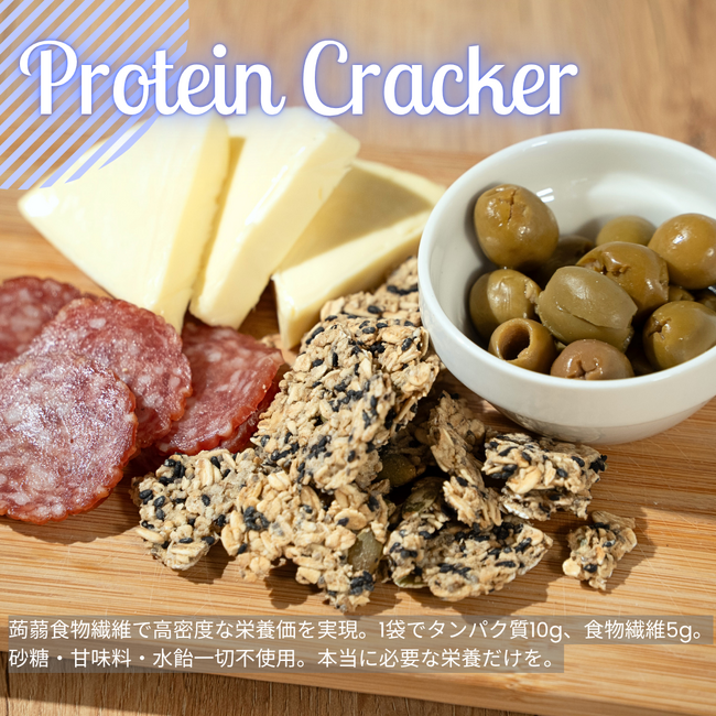 「ストイックすぎるプロテインクラッカー」蒟蒻ペーストやオーツ麦、パンプキンシードを主原料とすることで、1袋(50g)でタンパク質10.1g、食物繊維7.35gという高い栄養価を実現しました。トレーニング前後や、小腹が空いた時の栄養補給に最適です。