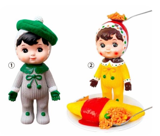 昭和40年代に初登場した当時から同じ金型を使い、職人が一つずつ手作業で作るオリジナルソフビ人形。大阪・梅田の「喫茶サンシャイン」と初コラボした“オムライスちゃん”もお目見え。